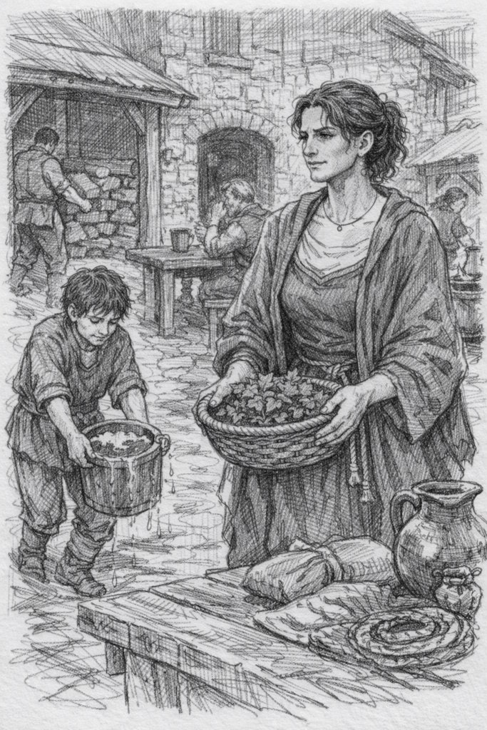 Prie pastogės du vaikinai nešė malkas ir krovė jas lygiai, tarsi net ugnis čia turėtų įžengti į namus su pagarba rytojui. Prie sienos moteris perrinkinėjo žalumynus ir trumpu rankos judesiu atskirdavo gerą nuo apvytusio. Berniūkštis nešė vandenį, ištaškydamas beveik pusę, ir niekas ant jo nešaukė. Viena darbininkių tik perėmė kibirą patogiau ir pasiuntė atgal – jau ne kaip nenaudingą vaiką, o kaip žmogų, kuriam tiesiog dar per anksti patikėti visą svorį.